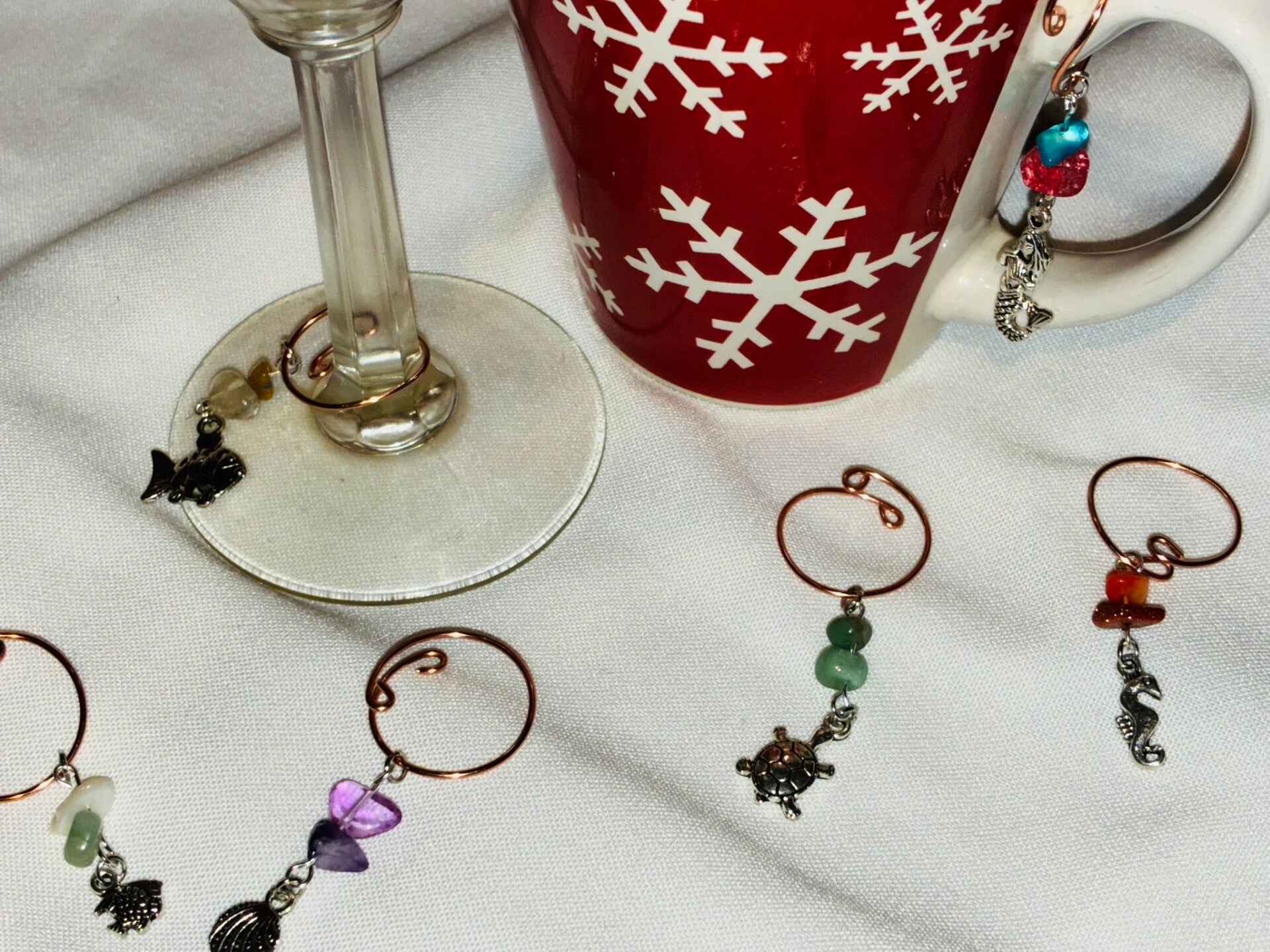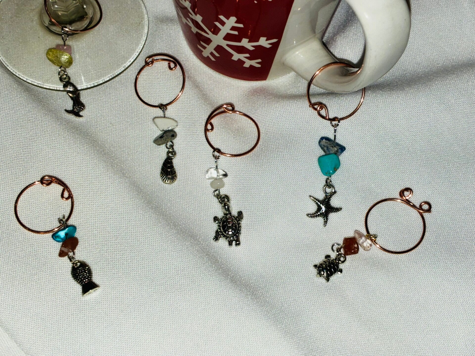 Made for stemmed glasses, mug handles, cup handles. Great for identifying glasses at get togethers or everyday use. Set of 6.